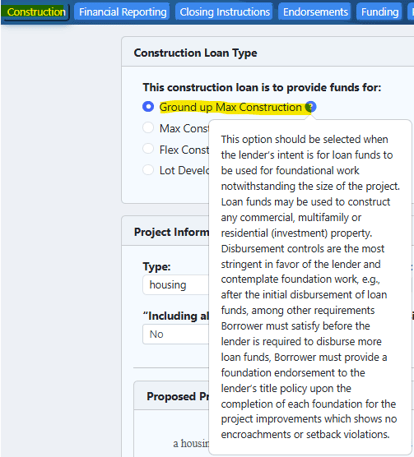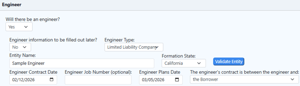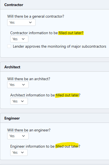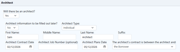 When entering a Construction Loan for Ground Up Max Construction the customer is able to also enter information for the general contractor, architect and engineer: