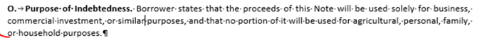 Specifically, business purpose loans are exempt from Regulation Z (which implements the Federal Truth in Lending Act "TILA"). In addition, business purpose loans are exempt from Regulation X (which implements the Real Estate Settlement Procedures Act "RESPA"). To ensure the loan is considered commercial (business purpose) we also include language that the loan will be used solely for business, commercial investment, or similar purposes, and that no portion of it will be used for agricultural, personal, family, or household purposes. Lastly, we include a Business Purpose of Loan Certification.