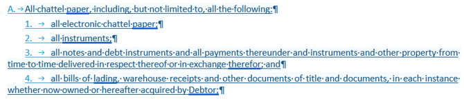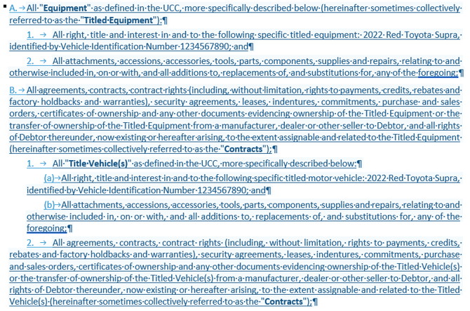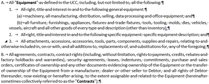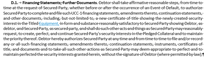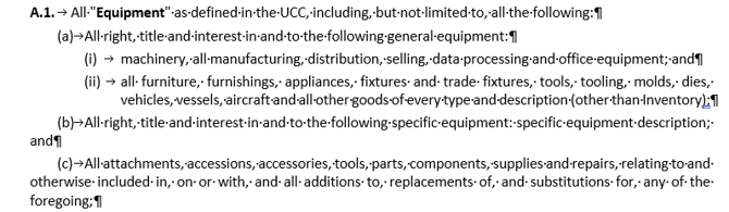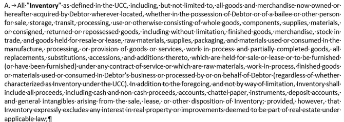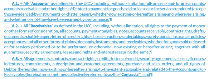 The collateral is all financial documents the company owns that represent money owed to them, including Lease contracts, finance agreements, notes owed to them, shipping & storage documents and all money or value that comes from those documents, now or in the future.
