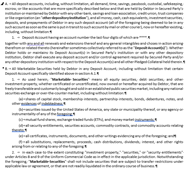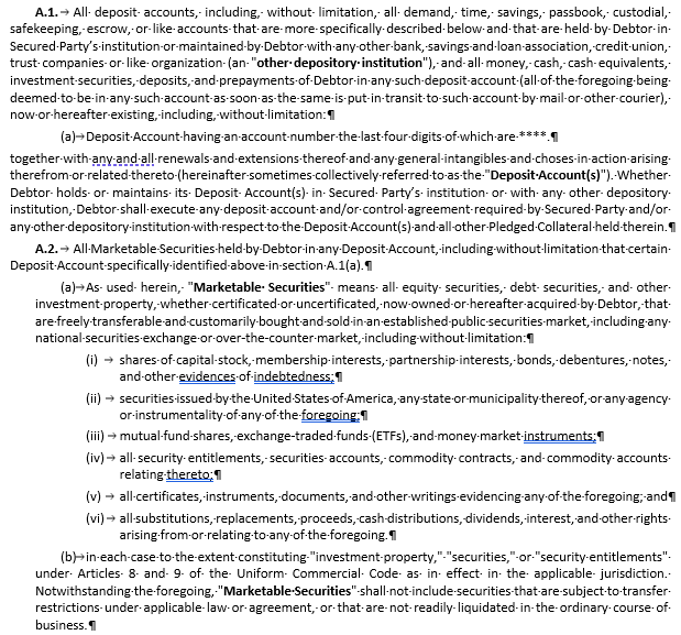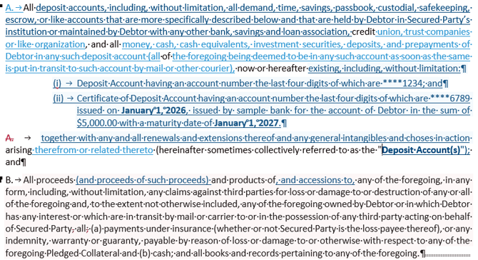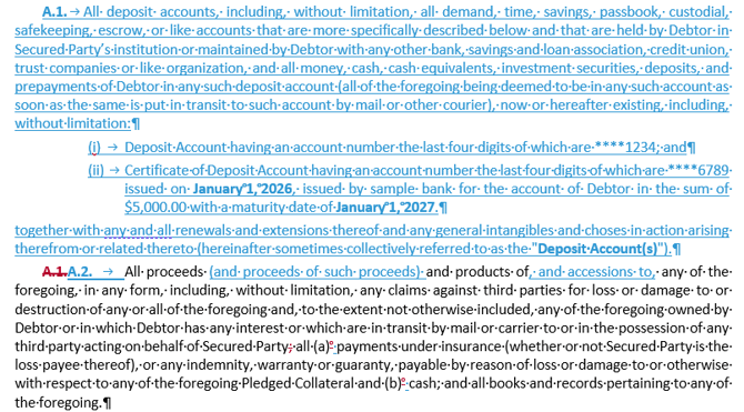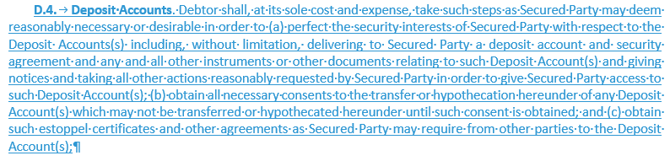 The lender is taking a claim on the Borrower’s bank money, its bank accounts and CD. To secure the loan, Borrower is pledging its cash and bank accounts as collateral. If it looks like company cash or turns into company cash, it’s part of the collateral.
