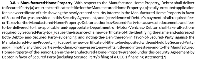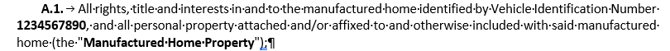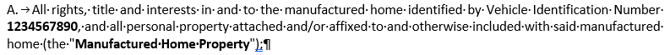 The collateral is a specific manufactured home and anything tied to it. More specifically, the borrower is pledging: 1) One manufactured home identified by a specific Vehicle Identification Number (VIN); 2) Everything attached to or included with that manufactured home, such as built‑in fixtures or related personal property; 3) Any money connected to that home, including Insurance payouts if it’s damaged or destroyed, Proceeds if it’s sold and claims, warranties, or settlement money. If the loan isn’t repaid, the lender can take and sell the manufactured home (and any related insurance or sale proceeds) to recover the money owed.