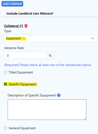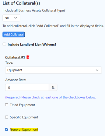 Difference between selecting general equipment versus special equipment will relfect in the security agreement: