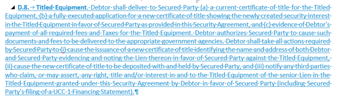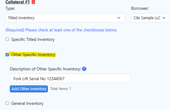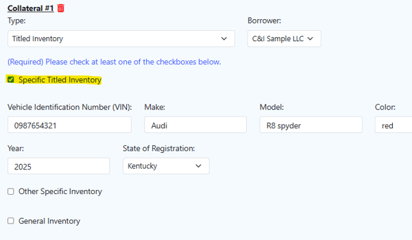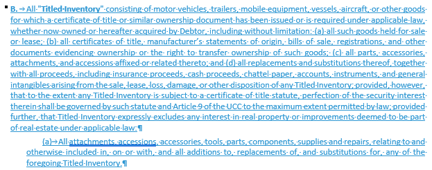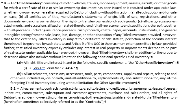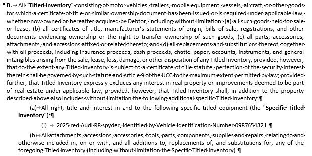 Specific Titled Inventory is a narrow, clearly identified subset of collateral e.g. assets that have certificates of title and each item is individually listed and identified. Property that requires a certificate of title, such as: Motor vehicles, Trailers, Mobile equipment, Vessels, Aircraft.