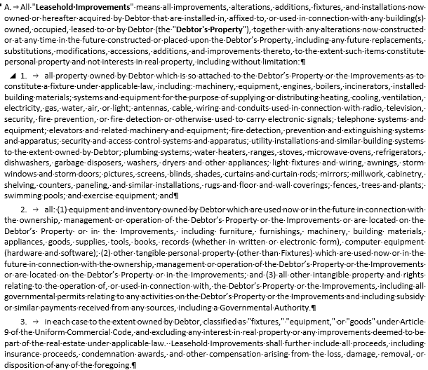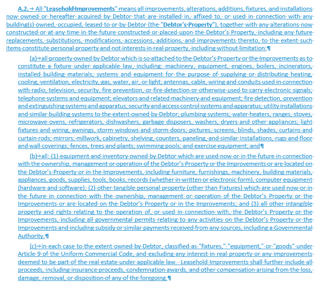 This is a lender taking a claim on the physical stuff borrower added or built inside a rented space: Walls, partitions, counters, built‑in cabinets and shelving, lighting, plumbing, HVAC, wiring, fixtures, security systems. Basically, it’s the improvements that were paid for to make the space work for the business, even though they don't own the building itself. It’s not cash and not easy to sell, it can lose value quickly, if the lease ends, the landlord may keep it and the lender may need landlord permission to access or remove it.