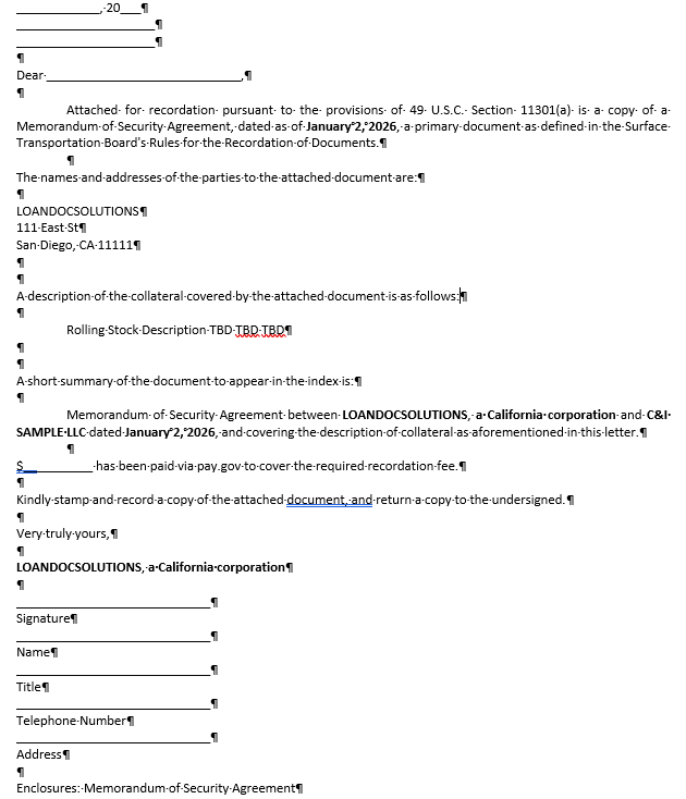 See Sample PDF of Memorandum of Security Agreement here: Memo of Security Agreement