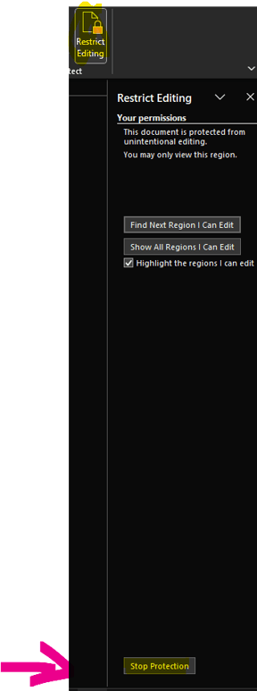 Please navigate to the Review tab on the ribbon, and after clicking on it, click on the Restrict Editing icon to open up a panel on the right hand side: