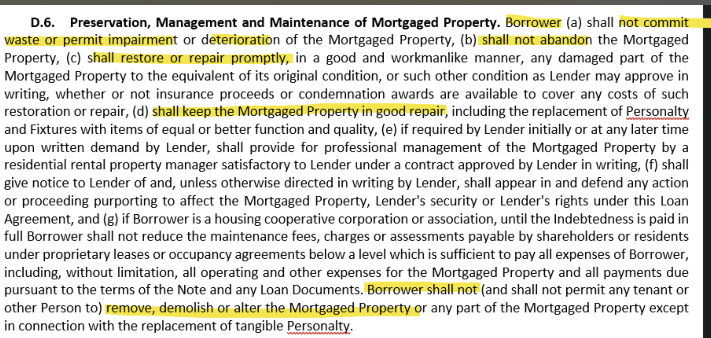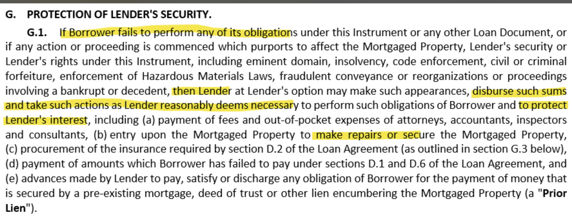 If the Borrower is unable to perform these obligations, the lender has the right (but not the obligation) to step in and make repairs or take actions necessary to protect the property and its security interest. Any amounts advanced by the lender for this purpose would be added to the loan balance.