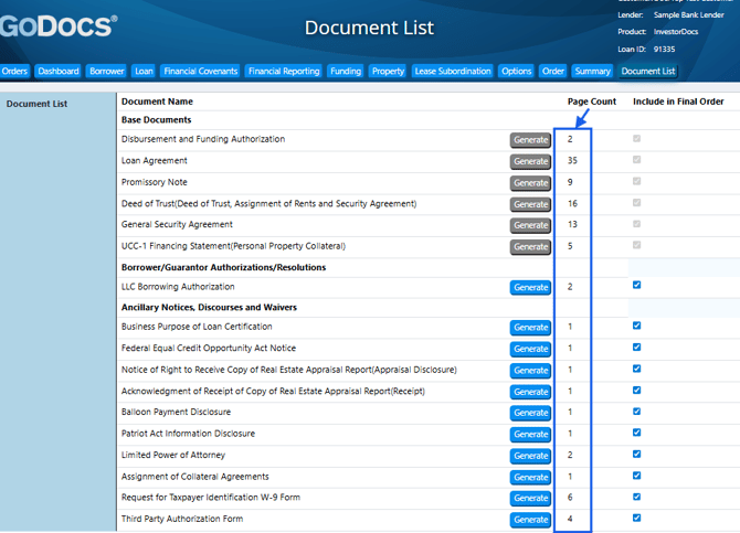 The Page Count feature provides visibility into how many pages will be included in the final document package based on order data.