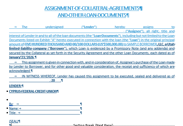 Those documents already give you full security interest as the lender. The Collateral Assignment is different. It is not about assigning collateral to you. It is about allowing you, as lender, to later assign your lender position out to someone else if needed. Why this is usually not applicable for a Credit Union.