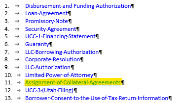 Selecting "Collateral Assignment" for C&I loan documents