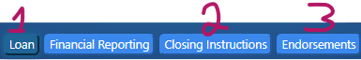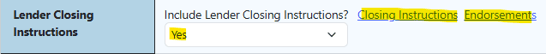 When activated and selected as "Yes" on the Loan page, two tabs will appear at the top of the page, Closing Instructions and Endorsements, respectively.