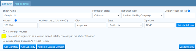 If you borrower is not registered as a foreign entity in the property state, you will leave the box unchecked.