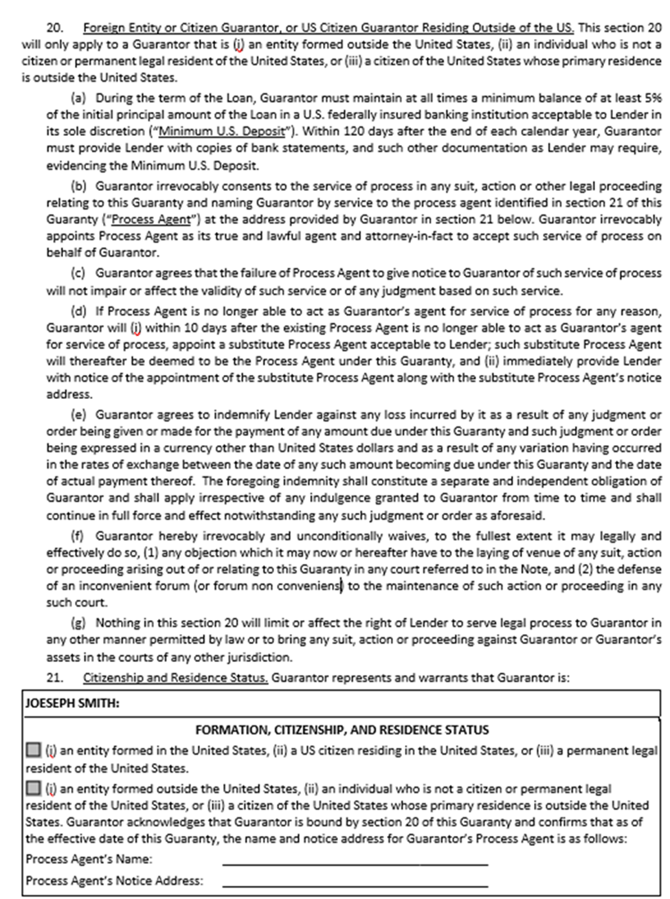 Identifies the obligations under US law for foreign nationals who may be borrowers, guarantors, or owners of a borrower entity. We do not make any representations as to the individual's citizenship other than individual borrowers. The residency of the signatories, and even guarantors, is not referenced in the docs.