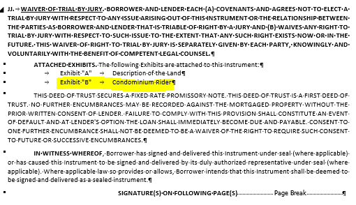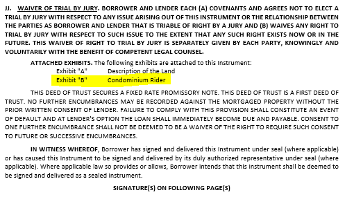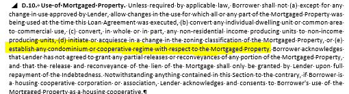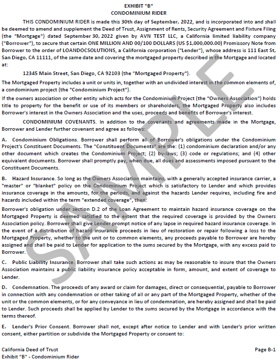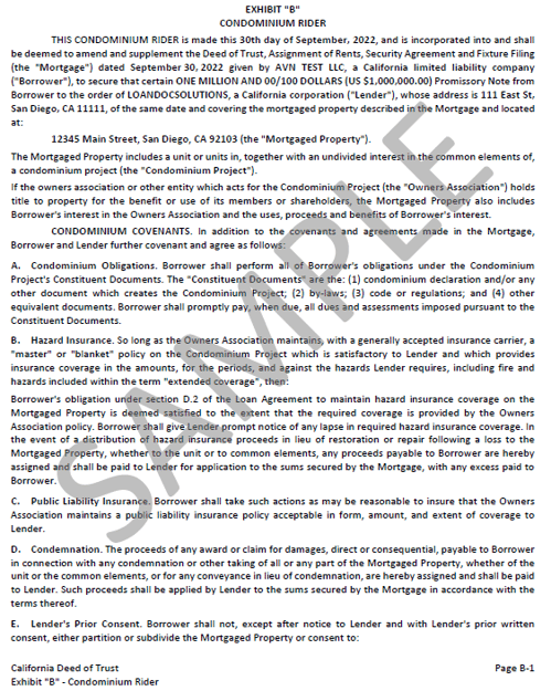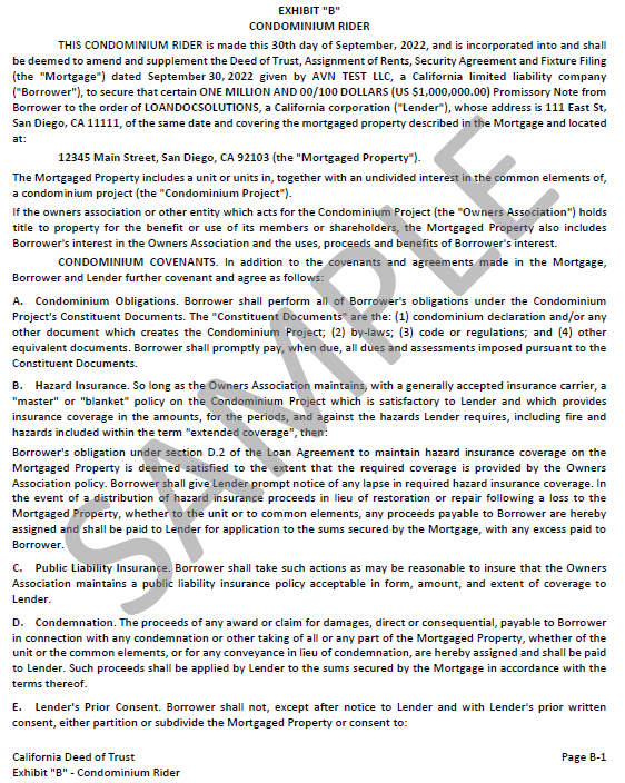 With the condo selection(s), the documents impacted are the Loan Agreement (Section D.11. Use of Mortgaged Property) and the Deed of Trust (Exhibit "B" Condominium Rider). Please see below screenshots for references on how the "Property consists of one or more condominium units" is reflected within our loan documents.