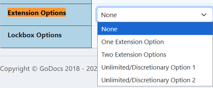 Use the drop-down to select: 3 Months, 6 Months, 8 Months, or 12 Months for the Extension Length in months and Input the Extension Fee Percentage