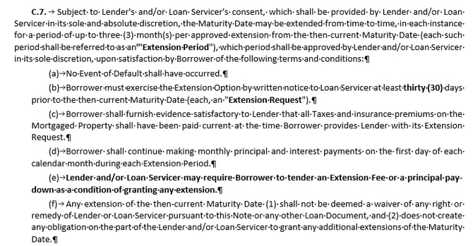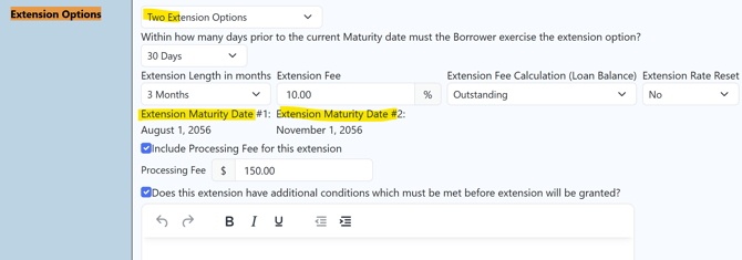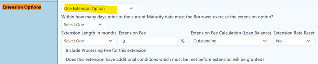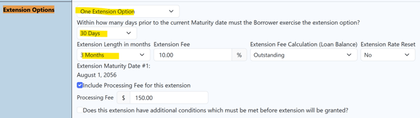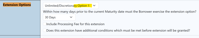 Use the drop-down to select: 10 Days, 30 Days, 60 Days, or 90 Days for the number of days prior to the current Maturity date the Borrower must exercise the extension option by. Use the drop-down to select: 3 Months, 6 Months, 8 Months, or 12 Months for the Extension Length in months and Input the Extension Fee Percentage. Example screenshot below:
