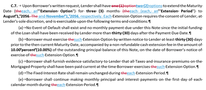 The difference in the output in the loandocuments between Unlimited/Discretionary Option 1 (red text) and Unlimited/Discretionary Option 2 (blue text) is below: