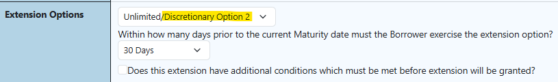 Use the drop-down to select: 10 Days, 30 Days, 60 Days, or 90 Days for the number of days prior to the current Maturity date the Borrower must exercise the extension option by