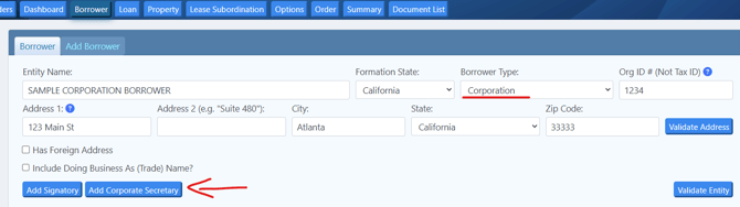 When entering your corporate borrower under the borrower tab please click the "Add Corporate Secretary" button for the field to open: