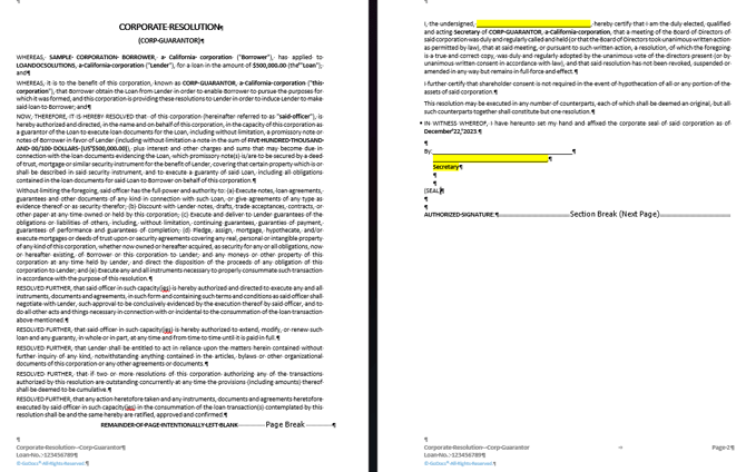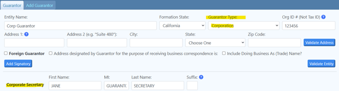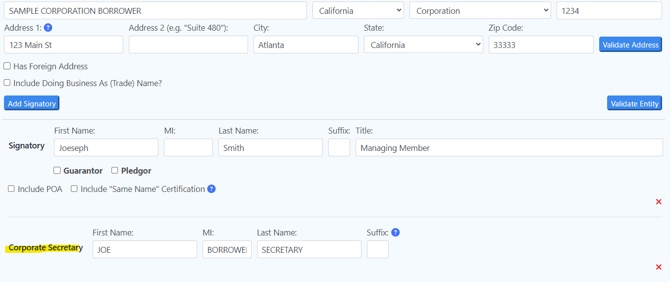 We recommend if this person appears elsewhere in the documents that they are referred to by the same name throughout the documents in order to avoid notary issues. Please be consistent with all names entered in to the data entry. For example: If the Corporate Secretary is also a Guarantor and his name is entered as Joe Smith for the Corporate Secretary then for the Guarantor, he should be referenced as Joe Smith, NOT Joe S. Smith, Joseph Smith, Joseph S. Smith, etc. (If you do need AKA names for this individual please refer to the Same Name Certification article)