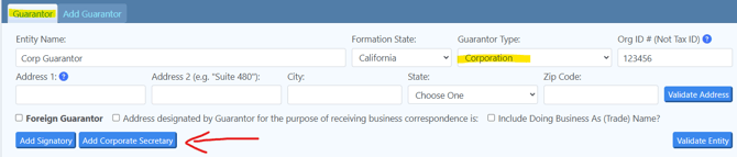 The Add Corporate Secretary button enables the database to allow additional functionality for that signer.